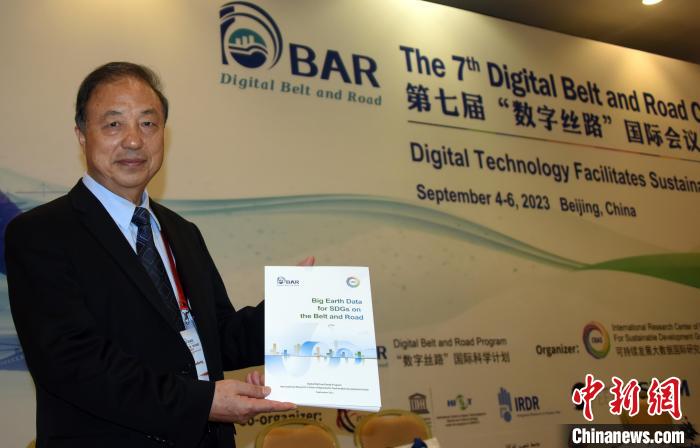 9月4日,第七屆“數(shù)字絲路”國際會議在北京開幕,DBAR主席郭華東院士展示當(dāng)天最新發(fā)布的《地球大數(shù)據(jù)助力“一帶一路”可持續(xù)發(fā)展》報告。中新網(wǎng)記者 孫自法 攝