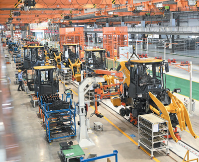6月2日,廣西柳州市柳工裝載機燈塔工廠里,工人在升級后的車間里趕制海外訂單。