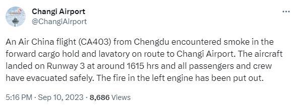另據(jù)中國國際航空官方微博消息,10日從成都天府機場飛往新加坡樟宜機場的CA403航班在著陸前出現(xiàn)客艙煙霧,機組按程序處置,飛機于北京時間16時14分降落新加坡樟宜機場,落地后機組組織旅客實施緊急撤離,新加坡樟宜機場啟動了應急程序。人機安全。事件原因正在調(diào)查中。