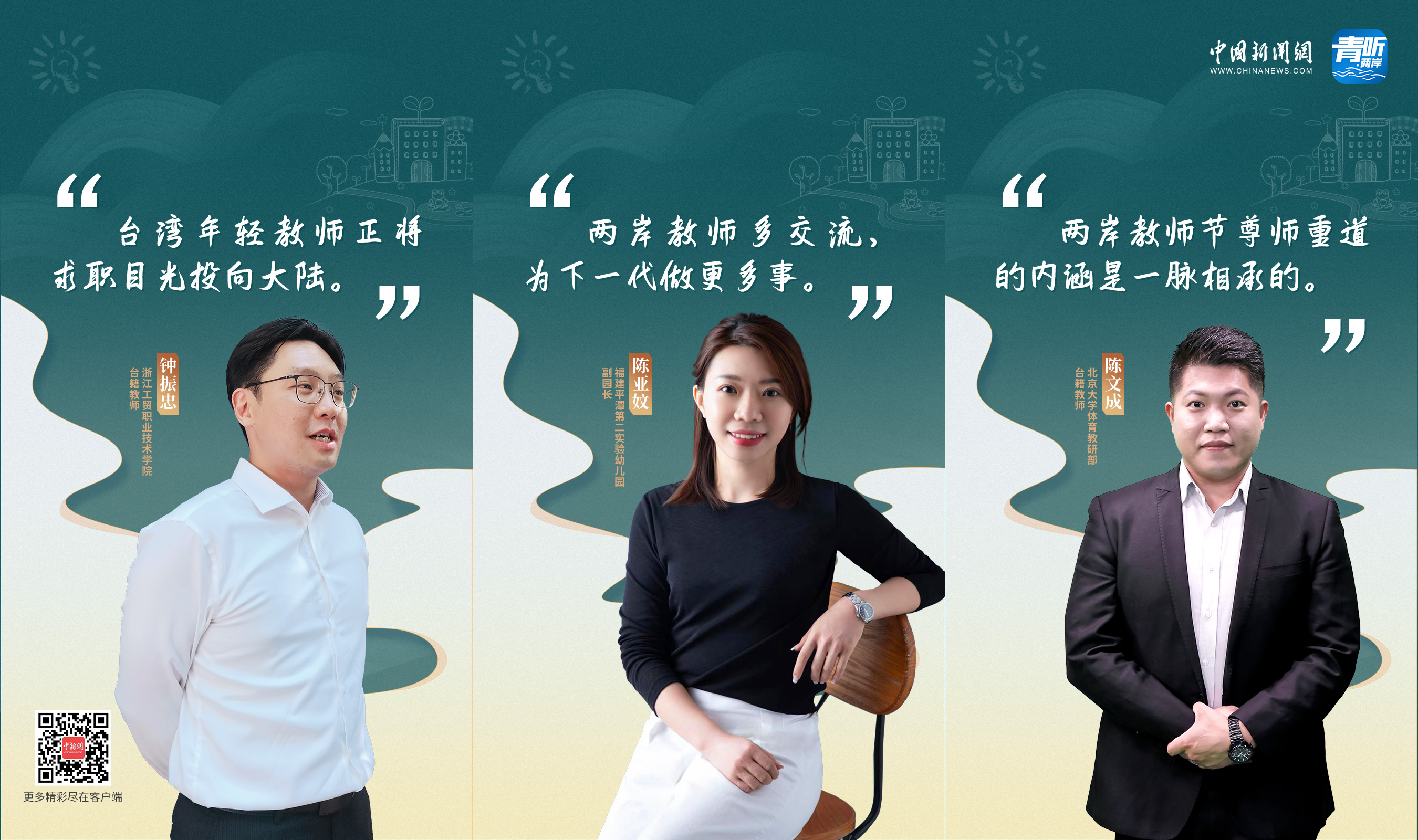 教師節(jié)這天,北京大學(xué)體育教研部教師陳文成、浙江工貿(mào)職業(yè)技術(shù)學(xué)院教師鐘振忠、福建平潭第二實(shí)驗(yàn)幼兒園副園長(zhǎng)陳亞妏,三位臺(tái)籍教師做客中國(guó)新聞網(wǎng)《青聽(tīng)·兩岸》欄目,分享了他們“登陸”做老師的故事。