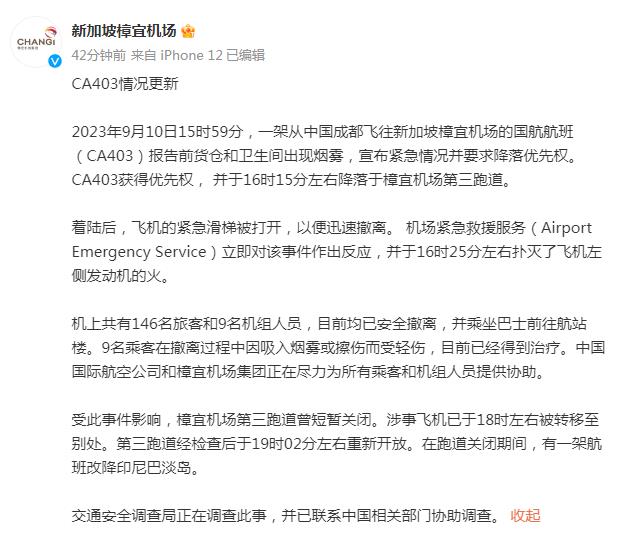 中新網北京9月10日電 據(jù)新加坡樟宜機場官方微博消息,2023年9月10日15時59分,一架從中國成都飛往新加坡樟宜機場的國航航班(CA403)報告前貨倉和衛(wèi)生間出現(xiàn)煙霧,宣布緊急情況并要求降落優(yōu)先權。CA403獲得優(yōu)先權, 并于16時15分左右降落于樟宜機場第三跑道。