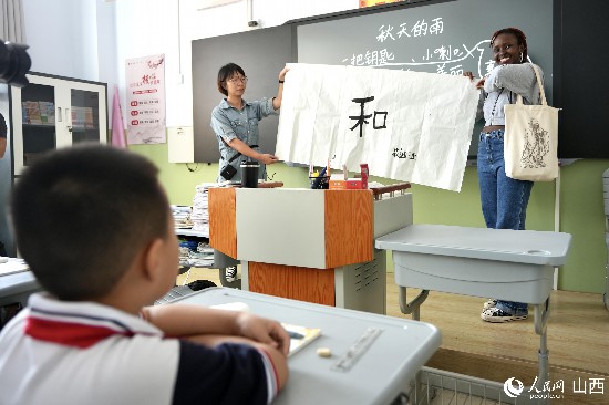 圖為莉迪亞給午亭小學(xué)三年級一班的同學(xué)贈送書法禮物。人民網(wǎng) 盧鵬宇攝