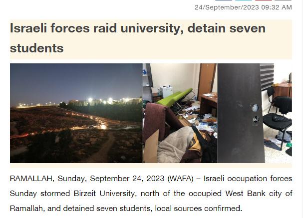 據(jù)報道,消息人士稱,以軍在突襲比爾宰特大學(xué)并破壞該校的物品和財產(chǎn)后,逮捕了7名學(xué)生,其中包括一名前囚犯。