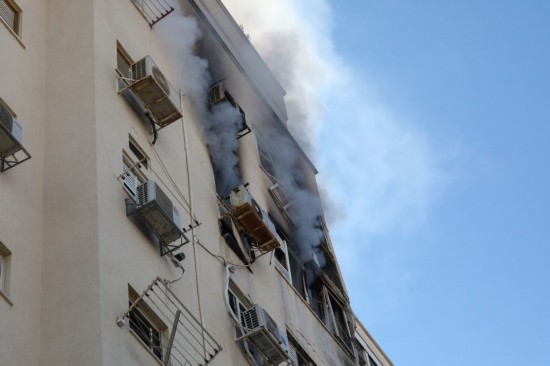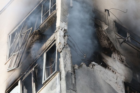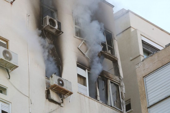 ↑這是10月7日在以色列特拉維夫拍攝的一棟遭火箭彈襲擊的建筑。新華社發(fā)(吉德翁·馬科維奇攝/基尼圖片社)