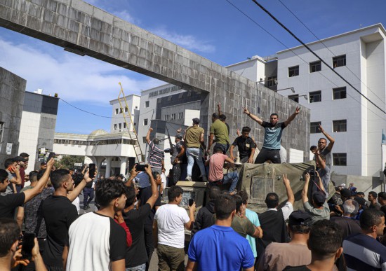 ↑10月7日,在加沙城,巴勒斯坦人登上一輛以色列軍用車輛。新華社發(fā)(里澤克·阿卜杜勒賈瓦德攝)
