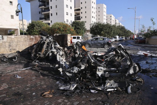 ↑這是10月7日在以色列南部城市阿什克隆拍攝的遭火箭彈破壞的車輛。新華社發(fā)(伊蘭·阿薩亞格攝/基尼圖片社)