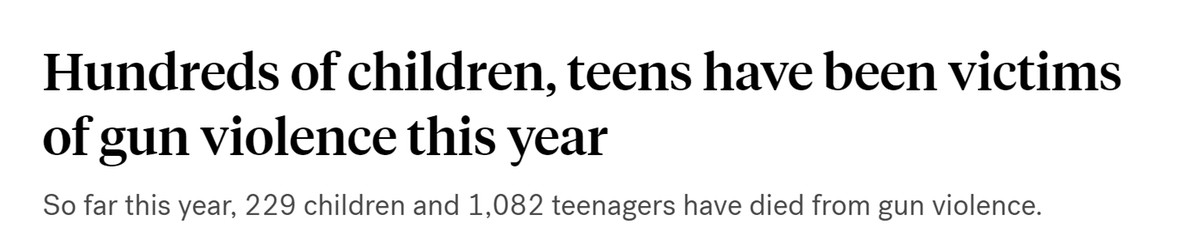 “槍支暴力檔案”的數(shù)據(jù)顯示,2023年到目前為止,美國(guó)已有229名年齡在11歲以下的兒童以及1082名青少年死于槍支暴力,受傷人數(shù)高達(dá)515名兒童和3025名青少年。
