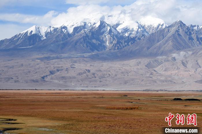 圖為10月2日拍攝的新疆喀什地區(qū)塔什庫(kù)爾干縣塔合曼濕地和慕士塔格雪峰。中新網(wǎng)記者 孫亭文 攝