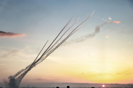 這是10月7日在加沙地帶城市拉法拍攝的向以色列發(fā)射的火箭彈。(新華社發(fā),哈立德·奧馬爾攝)