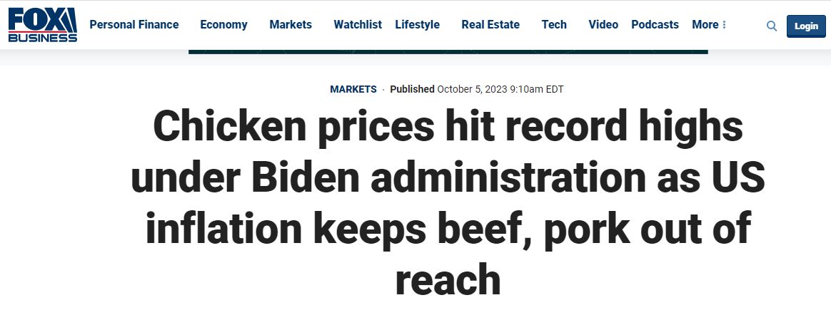 另據(jù)美國福克斯商業(yè)頻道(Fox Business)網(wǎng)站報(bào)道,受到持續(xù)通貨膨脹影響,美國牛肉和豬肉價(jià)格保持高位,普通消費(fèi)者不得不轉(zhuǎn)向略微便宜一些的雞肉。然而,全美零售店的雞肉價(jià)格也隨著需求量的增加而水漲船高,更是創(chuàng)下歷史新高,并且預(yù)計(jì)還將保持在高位。