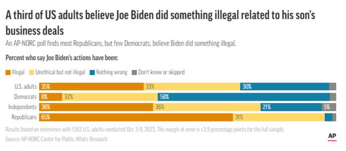 據(jù)美聯(lián)社報(bào)道,NORC公共事務(wù)研究中心的最新民調(diào)顯示,68%的受訪者認(rèn)為拜登與其子亨特·拜登處理海外商業(yè)交易的方式不道德或非法,其中33%的人認(rèn)為不道德,35%的人認(rèn)為非法。