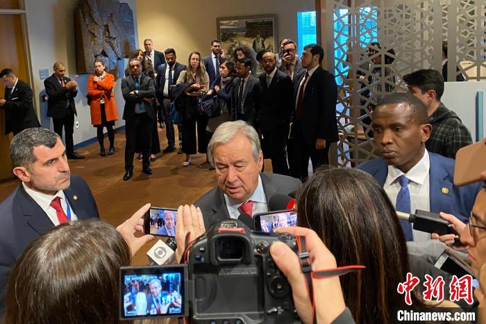 當(dāng)?shù)貢r間10月13日,聯(lián)合國秘書長古特雷斯在安理會就中東局勢進行緊急磋商后,在紐約聯(lián)合國總部回答記者提問?!≈行律缬浾?王帆 攝