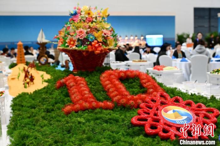 論壇新聞中心大門兩側(cè)擺放著兩塊主題燈光展板,走近細看,航行在大海中的帆船、在沙漠中行走的駱駝、“一帶一路”共建國家標(biāo)志性建筑物等多個具有象征意義的圖案細節(jié)盡在其中。在餐廳中央取餐臺上,代表著共建“一帶一路”倡議10周年的數(shù)字“10”,和祈年殿等中國古建筑物代表性元素也都精妙地融于一體。