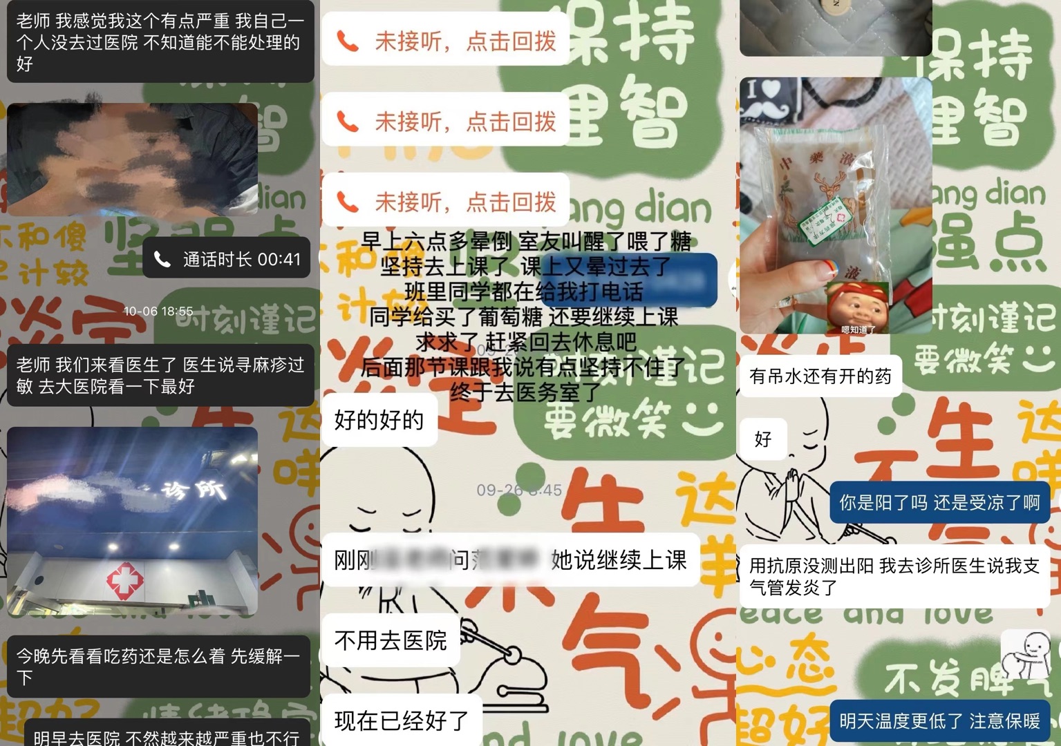 “因為我?guī)У膶W(xué)生基數(shù)較大,三百多人,每周基本上都會有十幾個因生病請假的學(xué)生?!?阿宛向中新網(wǎng)介紹,生病的學(xué)生中,最常見的是感冒發(fā)燒、胃疼等情況,也有一些突發(fā)狀況,比如“著急下樓收衣服結(jié)果被垃圾車刮到,半夜嘔吐到進(jìn)醫(yī)院,低血糖在課上暈倒”等。
