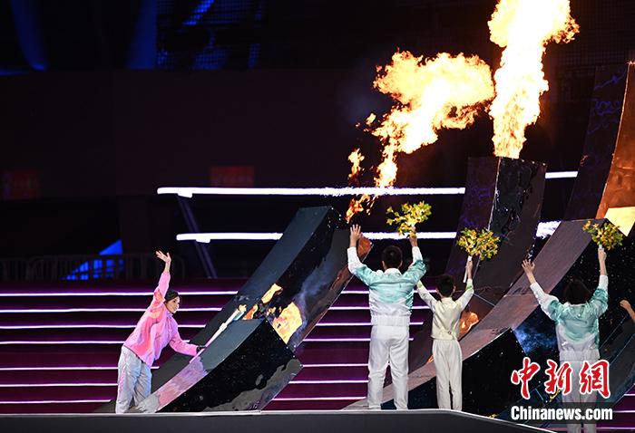火炬手徐佳玲用智能仿生手點(diǎn)燃主火炬。王剛攝