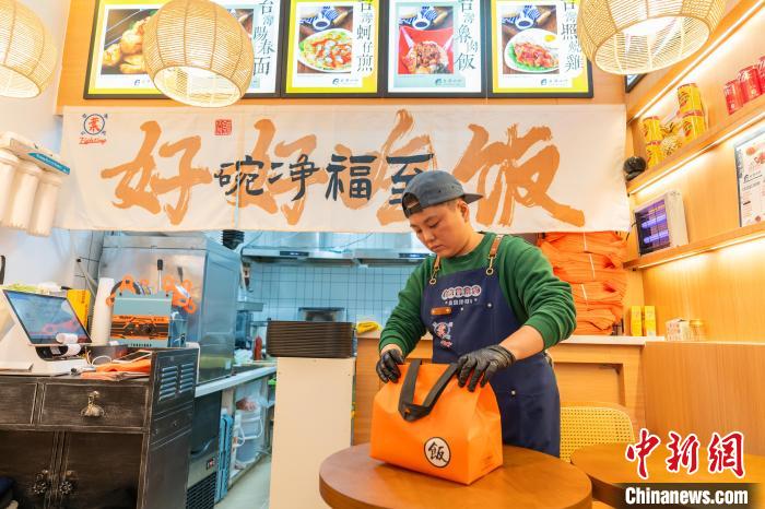 10月22日,臺(tái)灣餐飲人葉韋廷在重慶店內(nèi)將美食打包?!≈行律缬浾?鐘旖 攝