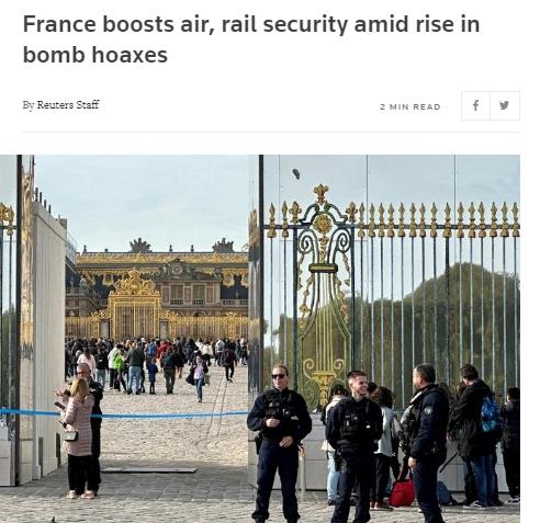 當(dāng)?shù)貢r間19日,法國14個機場收到炸彈威脅,至少9個機場進(jìn)行疏散。凡爾賽宮也在不到一周的時間內(nèi)第4次進(jìn)行疏散。