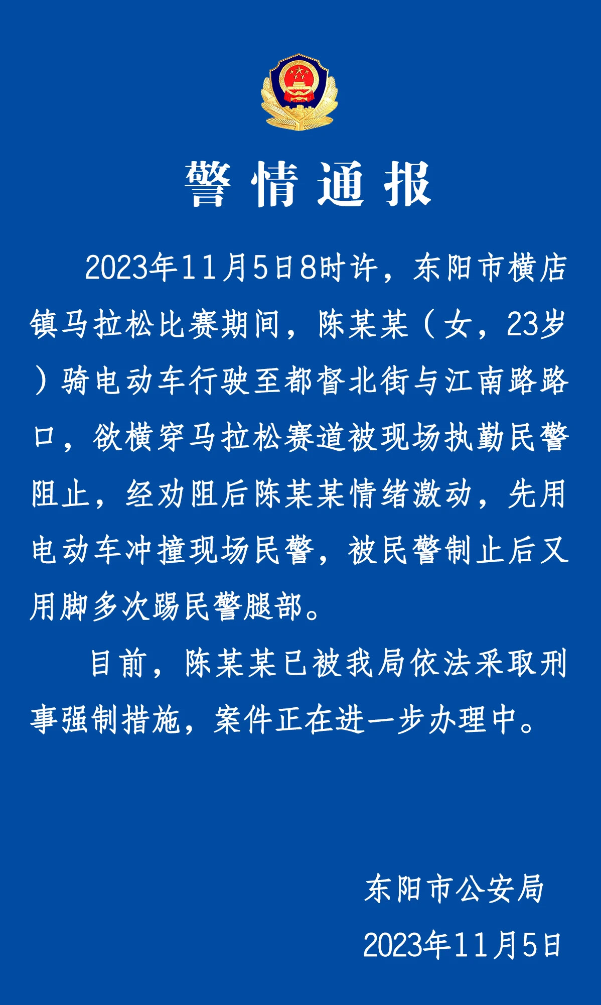 中新網金華11月6日電(董易鑫)浙江金華東陽市公安局11月5日發(fā)布警情通報稱,2023年11月5日8時許,東陽市橫店鎮(zhèn)馬拉松比賽期間,陳某某(女,23歲)騎電動車行駛至都督北街與江南路路口,欲橫穿馬拉松賽道被現場執(zhí)勤民警阻止,經勸阻后陳某某情緒激動,先用電動車沖撞現場民警,被民警制止后又用腳多次踢民警腿部。