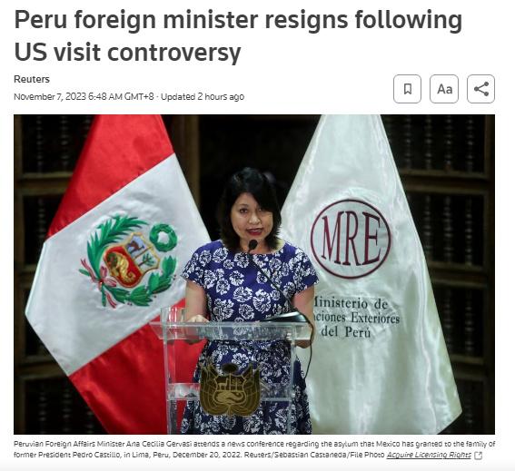 中新網(wǎng)11月7日電 據(jù)路透社報(bào)道,當(dāng)?shù)貢r(shí)間6日,秘魯外交部長安娜·赫瓦西在其上任不到一年后宣布辭職。