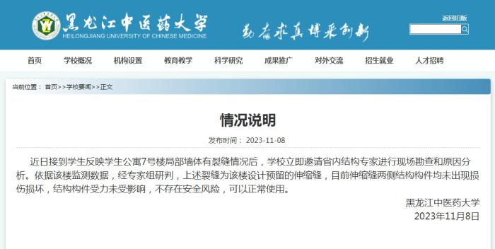 中新網(wǎng)11月9日電 據(jù)黑龍江中醫(yī)藥大學(xué)網(wǎng)站消息,近日,黑龍江中醫(yī)藥大學(xué)接到學(xué)生反映學(xué)生公寓7號樓局部墻體有裂縫情況后,學(xué)校立即邀請省內(nèi)結(jié)構(gòu)專家進行現(xiàn)場勘查和原因分析。依據(jù)該樓監(jiān)測數(shù)據(jù),經(jīng)專家組研判,上述裂縫為該樓設(shè)計預(yù)留的伸縮縫,目前伸縮縫兩側(cè)結(jié)構(gòu)構(gòu)件均未出現(xiàn)損傷損壞,結(jié)構(gòu)構(gòu)件受力未受影響,不存在安全風(fēng)險,可以正常使用。