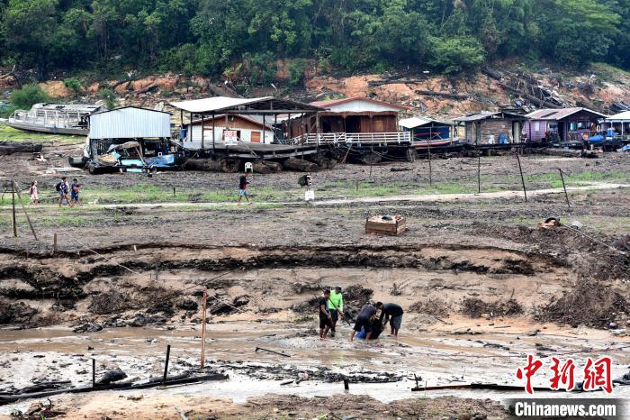 巴西亞馬孫持續(xù)干旱,亞馬孫河多條支流航運(yùn)物流停擺。圖為10月16日,巴西亞馬孫河支流的大衛(wèi)碼頭,當(dāng)?shù)卣汕踩藛T在疏浚河道。中新社記者 林春茵 攝