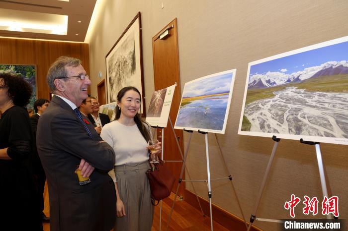 當(dāng)?shù)貢r(shí)間11月8日,中國(guó)駐加拿大使館舉辦國(guó)家公園圖片展暨招待會(huì)。圖為與會(huì)嘉賓觀看三江源國(guó)家公園照片?!≈行律缬浾?余瑞冬 攝