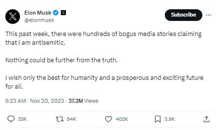 據(jù)報(bào)道,馬斯克在社交媒體平臺(tái)X上寫(xiě)道,“過(guò)去一周,有數(shù)百個(gè)虛假的媒體報(bào)道聲稱我是反猶太主義者。事實(shí)并非如此。我只希望人類一切都好,所有人都有一個(gè)繁榮和令人興奮的未來(lái)。”