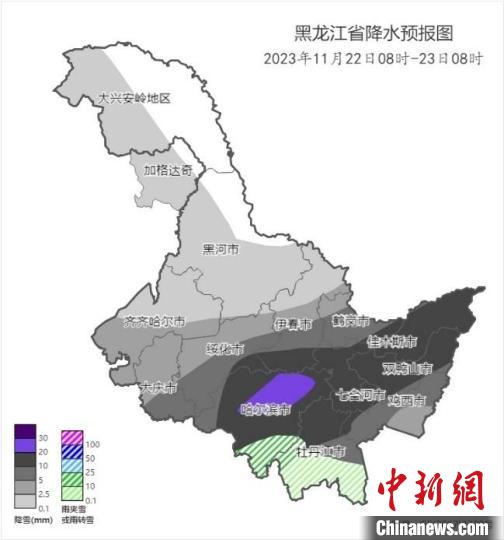 黑龍江省2023年11月22日8時(shí)至23日8時(shí)累計(jì)降水量預(yù)報(bào)圖。黑龍江省氣象局供圖