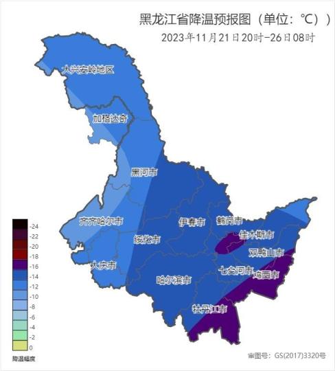 黑龍江省2023年11月21日20時(shí)至26日8時(shí)降溫預(yù)報(bào)圖。黑龍江省氣象局供圖