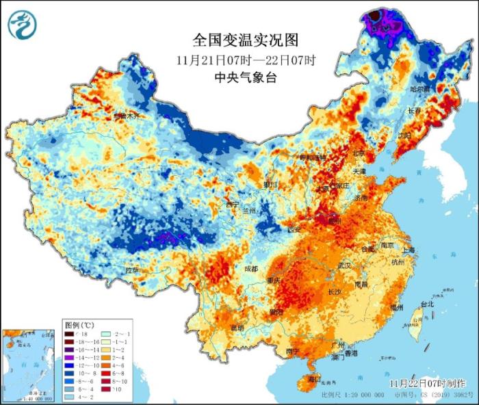 中新網(wǎng)11月22日電 據(jù)中央氣象臺(tái)網(wǎng)站消息,今晨,中東部大部地區(qū)仍有不同程度的回暖,但這也將是本輪寒潮過(guò)程來(lái)前最后的溫暖。目前冷空氣已經(jīng)開(kāi)始影響黑龍江西北部,漠河今晨氣溫達(dá)到-27.3℃,比昨日同時(shí)刻降低20℃。中央氣象臺(tái)今晨繼續(xù)發(fā)布寒潮、暴雪、大風(fēng)三個(gè)預(yù)警。其中,未來(lái)24小時(shí),內(nèi)蒙古東部、黑龍江中東部將有大范圍強(qiáng)降雪,需要特別小心!