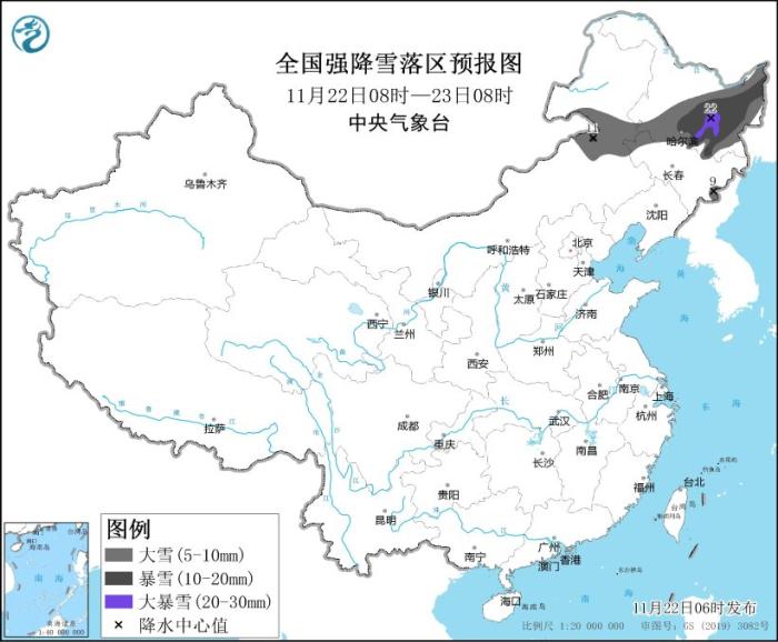 暴雪黃色預(yù)警:預(yù)計(jì),11月22日08時(shí)至11月23日08時(shí),內(nèi)蒙古東部、黑龍江中東部、吉林北部和長(zhǎng)白山區(qū)等地的部分地區(qū)有大到暴雪,其中,黑龍江中部局地有大暴雪(20~22毫米);上述地區(qū)新增積雪深度6~12厘米,局地可達(dá)16厘米以上。