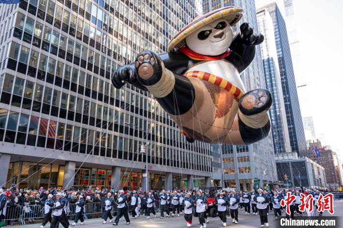 當(dāng)?shù)貢r(shí)間11月23日,第97屆梅西百貨感恩節(jié)大游行在美國紐約曼哈頓舉行。圖為基于動(dòng)畫電影《功夫熊貓》里阿寶的造型設(shè)計(jì)的巨型氣球行進(jìn)在曼哈頓街頭?!≈行律缬浾?王帆 攝