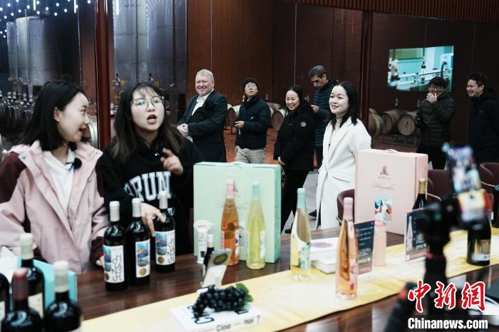 澳大利亞駐華大使館公使銜參贊樊思明(左三)被賀蘭神酒莊工作人員直播帶貨的場景吸引。中新網(wǎng)記者 崔楠 攝