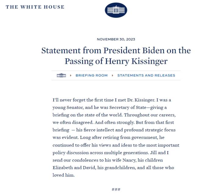 中新網(wǎng)12月1日電 綜合報道,美國前國務(wù)卿基辛格于當?shù)貢r間11月29日去世,享年100歲。當?shù)貢r間11月30日,美國白宮網(wǎng)站發(fā)布了拜登的哀悼聲明。