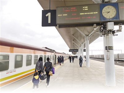 由中國路橋工程有限責任公司承建的蒙內(nèi)鐵路是肯尼亞獨立以來建設的首條鐵路,也是一條采用中國標準、中國技術、中國裝備建造的現(xiàn)代化鐵路,被譽為中國和肯尼亞共建“一帶一路”標志性工程。圖為蒙內(nèi)鐵路列車??吭趦?nèi)羅畢站。