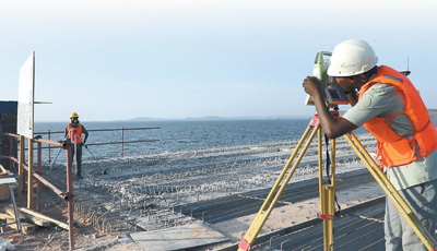 坦桑尼亞馬古富力大橋由中國土木工程集團有限公司和中鐵十五局聯(lián)合承建,連接坦桑尼亞蓋塔省和姆萬扎省,是坦桑尼亞重要的內(nèi)陸國際通道。大橋建成后將極大改善當?shù)亟煌顩r,帶動坦桑尼亞與周邊國家的互聯(lián)互通,促進區(qū)域經(jīng)濟社會發(fā)展。圖為該項目外籍工程師正在使用全站儀進行室外測控。