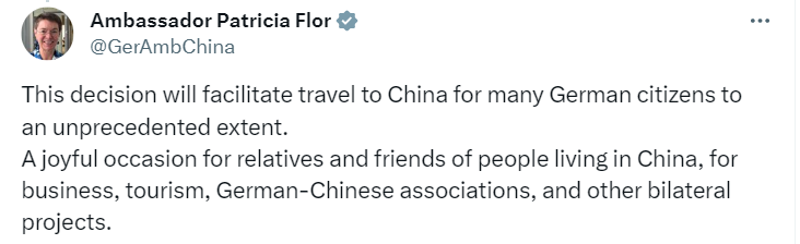 德國駐華大使傅融(Patricia Flor)在社交媒體平臺寫道:“這一決定將在前所未有的程度上為德國公民前往中國帶來便利。無論是在華的商務人士、旅游人士、德中協(xié)會以及從事其他雙邊項目的朋友,這都是一個歡樂時刻。”
