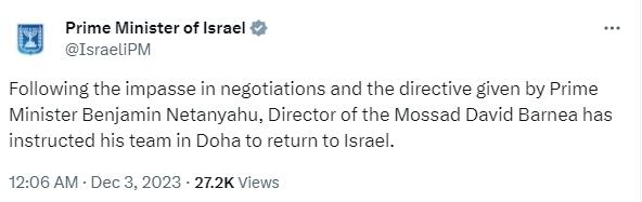 聲明稱,“談判陷入僵局后,經(jīng)(以色列)總理內(nèi)塔尼亞胡指示,(以色列情報機(jī)構(gòu))摩薩德負(fù)責(zé)人大衛(wèi)·巴尼亞命令其在多哈的團(tuán)隊(duì)返回以色列?!?/p>