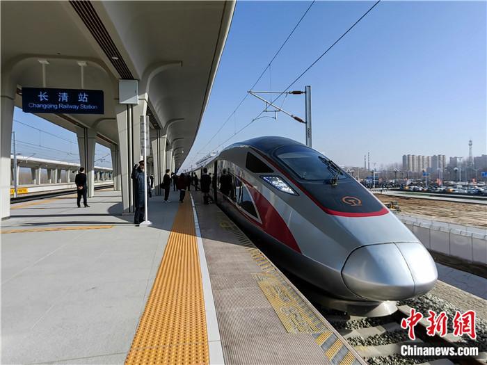 12月8日,濟(jì)鄭高鐵全線通車(chē)。圖為在濟(jì)南長(zhǎng)清站始發(fā)前往鄭州的復(fù)興號(hào)列車(chē)。沙見(jiàn)龍 攝