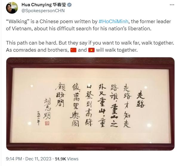 華春瑩寫道,“《走路》是越南老一輩領(lǐng)導(dǎo)人胡志明所寫的一首漢語(yǔ)詩(shī),講述了他爭(zhēng)取國(guó)家解放的艱難歷程。這條路可能很艱難。但人們說,如果想走得遠(yuǎn),就要一起走。作為同志和兄弟,中國(guó)和越南將一路同行?!?/p>