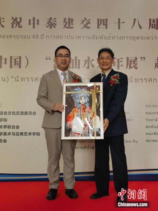 潮汕水彩畫院院長李小澄(右)向泰國文化部贈送畫作。李映民 攝