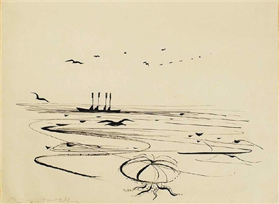在人物肖像之外,萬徒勒里也熱衷于描繪中國山水。他于1954年創(chuàng)作的《長江》借鑒了中國水墨丹青技法,整幅畫作視野開闊,體現(xiàn)出中國水墨畫的朦朧、婉約與詩意。他在客居瑞士期間的畫作同樣展現(xiàn)中國水墨畫開闊的構(gòu)圖、精巧的線條和獨(dú)具一格的東方美學(xué)。畫作《歸來》通過南飛的歸雁、孤寥的漁船和茫茫無盡的海面,讓觀者感受到一種難以訴諸語言、始終縈繞心頭的鄉(xiāng)愁。