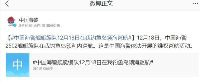 中新網(wǎng)12月18日電 據(jù)中國海警官方微博消息,12月18日,中國海警2502艦艇編隊在我釣魚島領(lǐng)海內(nèi)巡航。這是中國海警依法開展的維權(quán)巡航活動。