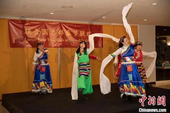 資料圖:當地時間1月20日,聯合國中國書會舞蹈團在紐約聯合國總部舉辦的春節(jié)聯歡晚會上表演《格桑拉》。中新社記者 廖攀 攝