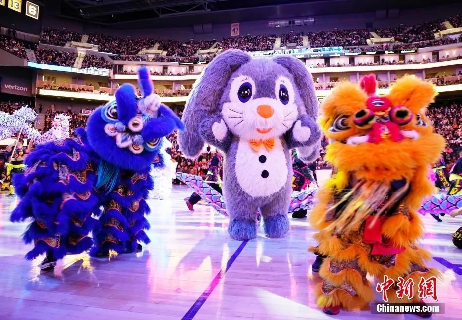 資料圖:當地時間1月22日,中國農歷新年正月初一晚,美職籃(NBA)金州勇士隊在主場迎戰(zhàn)布魯克林籃網隊的比賽中,按照多年的傳統慶祝中國農歷新年的到來。圖為兔子人偶出現在舞龍舞獅表演中。中新社記者 劉關關 攝