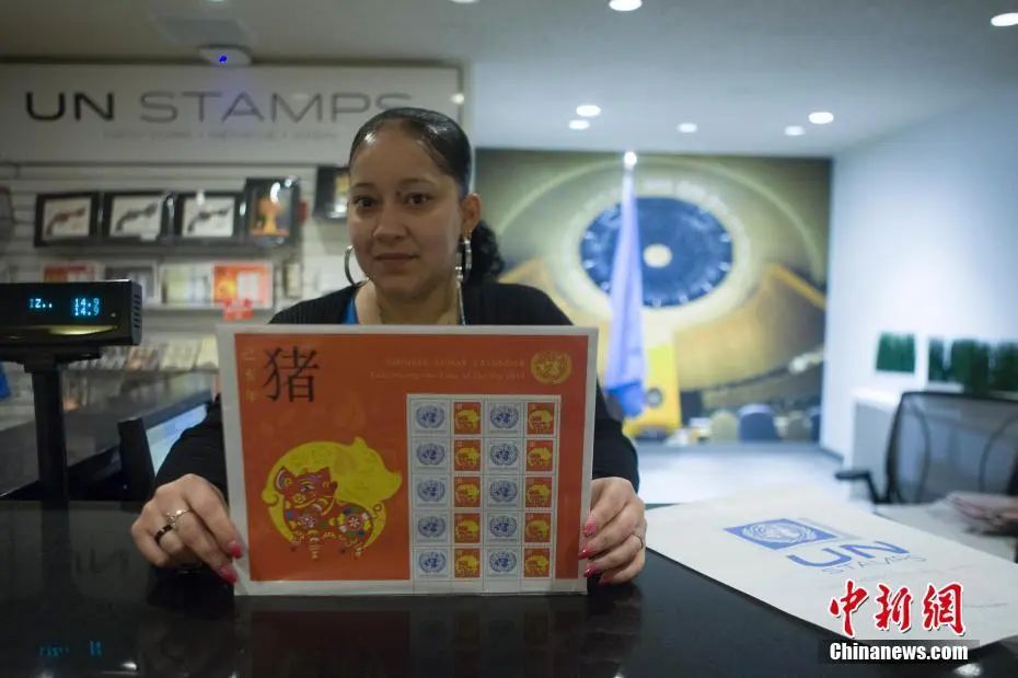 資料圖:2019年1月11日,為慶祝即將到來的中國農歷己亥豬年,聯合國郵政管理處正式發(fā)行“中國農歷生肖”系列己亥豬年特別版郵票。圖為紐約聯合國總部郵管處銷售點的工作人員展示己亥豬年特別版郵票。中新社記者 馬德林 攝