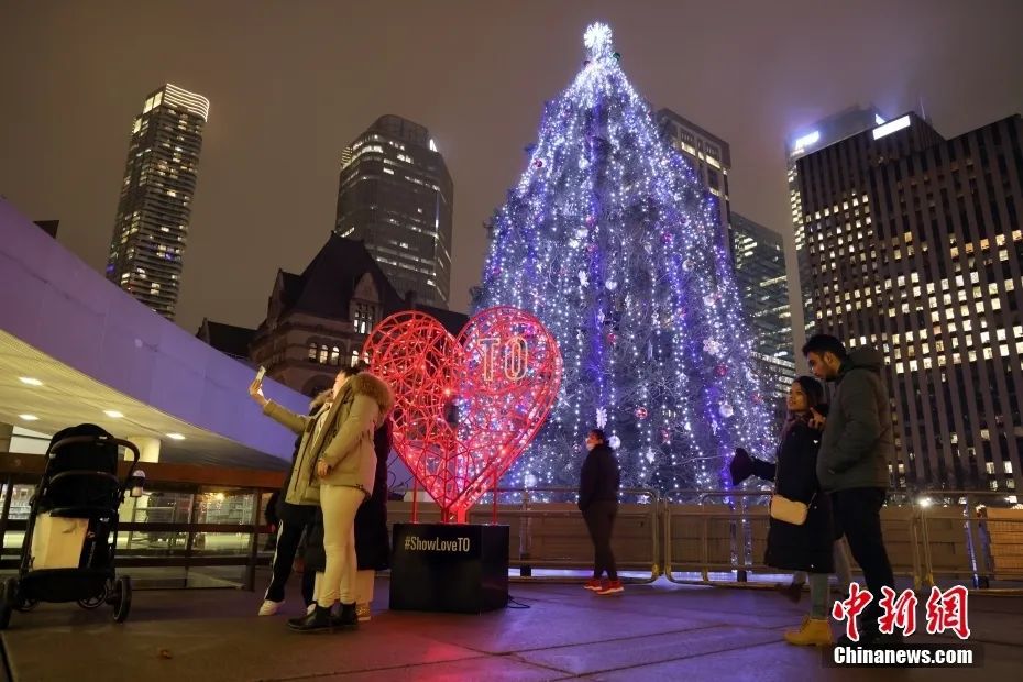 資料圖:當地時間2021年12月24日,圣誕平安夜,加拿大多倫多市政廳廣場的圣誕樹與愛心造型的彩燈吸引民眾駐足留影。中新社記者 余瑞冬 攝