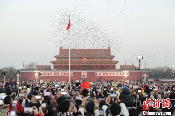 隨著國(guó)旗升至旗桿頂端,萬羽和平鴿騰空而起,繞著天安門廣場(chǎng)盤旋。在《歌唱祖國(guó)》的旋律中,“新年快樂!”“我愛你,祖國(guó)!”……歡呼聲和掌聲此起彼伏。