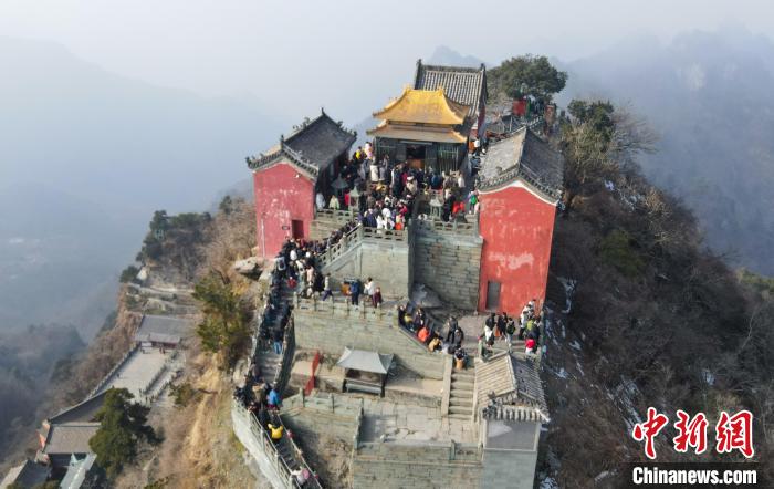 1月1日,武當(dāng)山金頂上前來(lái)祈福的游客絡(luò)繹不絕。(無(wú)人機(jī)照片)張倩龍 攝