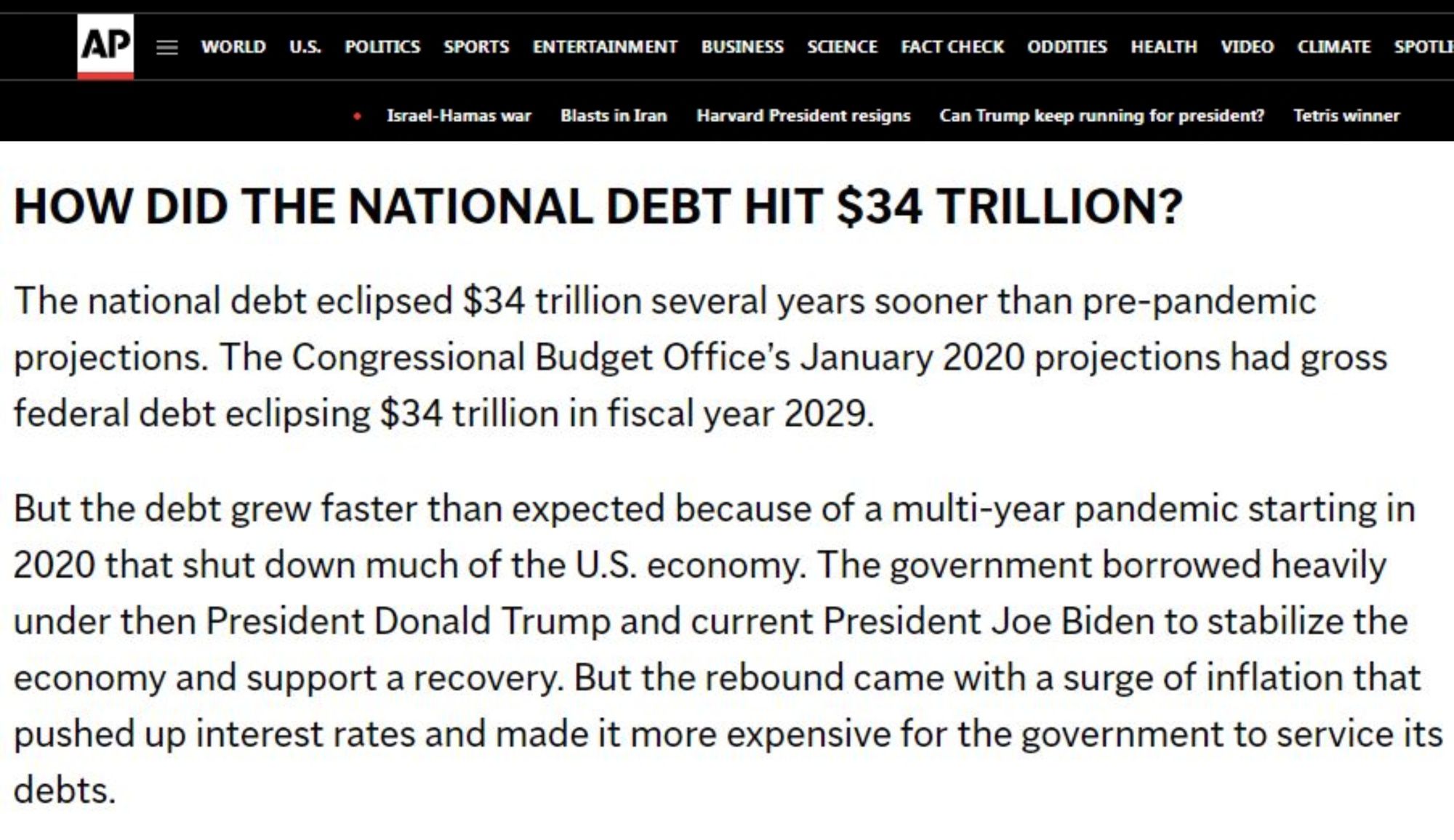 美聯(lián)社的報(bào)道指出,正是由于投資者長(zhǎng)期以來愿意借錢給美國政府,后者才得以在不增加稅收的情況下持續(xù)花錢?!暗磥韼资甑膫鶆?wù)路徑可能會(huì)危及美國的國家安全和主要支出項(xiàng)目,包括社會(huì)保障和醫(yī)療保險(xiǎn)”。